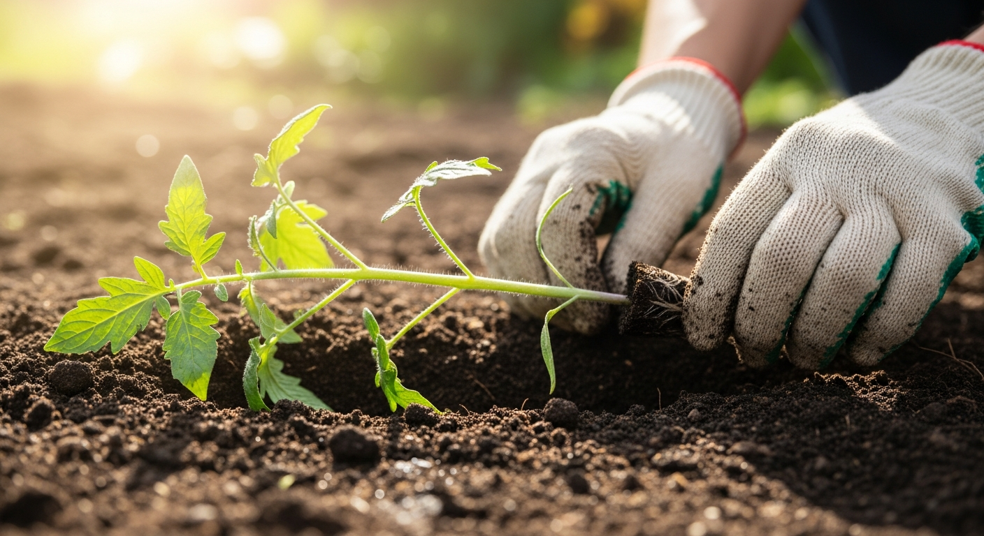 Забудьте про класичні лунки. Для нашої витягнутої розсади потрібна траншея. Копаємо рівчачок глибиною 10-15 см і довжиною, що відповідає вашому стеблу. Перед посадкою обережно обриваємо все нижнє листя, залишаючи лише верхівку з 3-4 здоровими листочками. А тепер найцікавіше: кладемо нашу рослину в траншею майже горизонтально, ніби вкладаємо спати. Верхівку акуратно підіймаємо і направляємо вгору. Корінь можна направити на південь — так він швидше прогріється. Засипаємо все це пухкою землею, залишаючи над поверхнею лише нашу зелену «маківку». І ось ключовий нюанс, про який часто забувають: не поливайте в саму траншею! Якщо ви заллєте водою закопане стебло, воно може просто згнити від нестачі кисню. Зробіть навколо посадженої рослини невеликий круговий бортик і полийте воду саме туди. Це змусить нові корінці тягнутися в сторони і вглиб у пошуках вологи, а не сидіти в болоті.