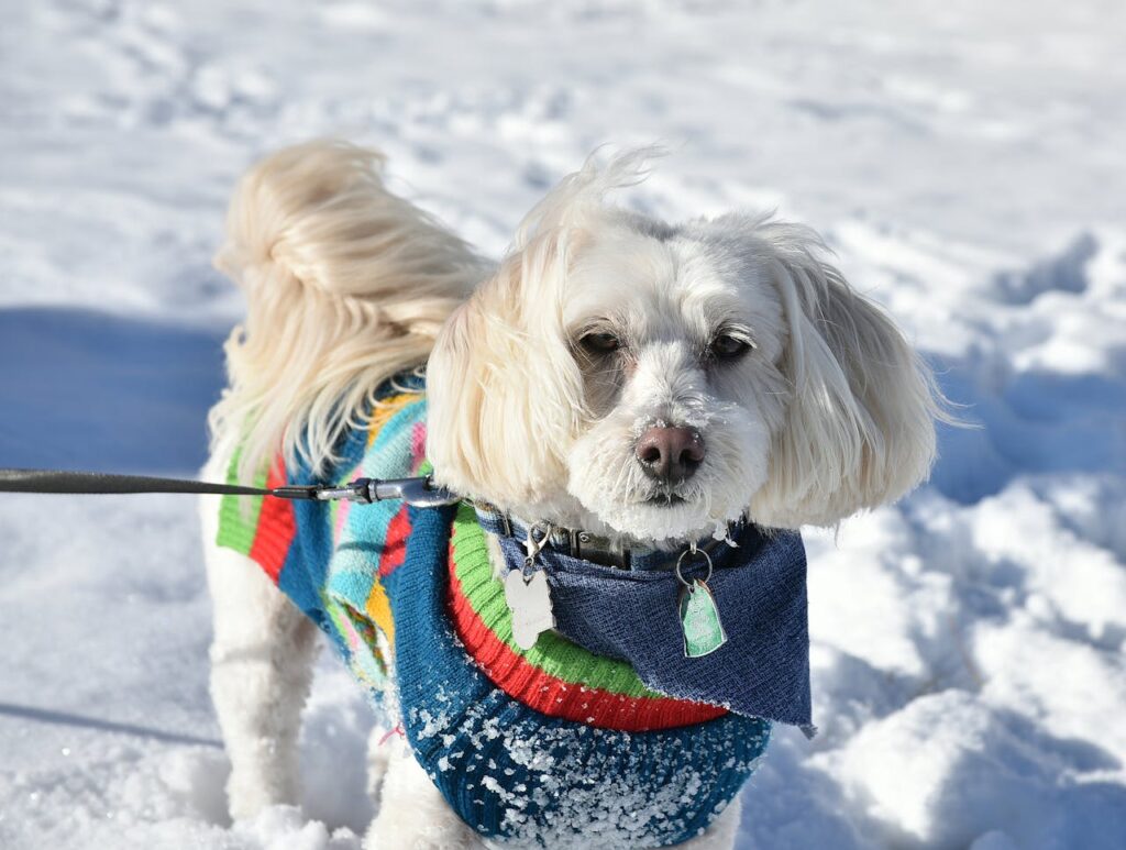 Коли температура опускається нижче нуля, маленьких собак варто одягати в теплі светри або пальто, а також взувати їм зимові черевики. Тривалість прогулянок в таку погоду слід обмежити до 15-20 хвилин.
